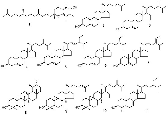 Structures of compounds identified by GC/MS. The structures are 1. α-tocopherol; 2. cholesterol; 3. 24-methylenecholesterol; 4. campesterol; 5. stigmasterol; 6. sitosterol; 7. isofucosterol; 8. α-amyrin; 9. cycloartenol; 10. 24-methylenecycloartanol; and 11. citrostadienol.