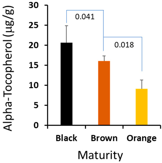 The α-tocopherol contents in the peanuts’ hearts are correlated to the maturity. The error bars are standard deviation of 5 independent measurements and the p-values of Student’s t-test between the maturity stages.