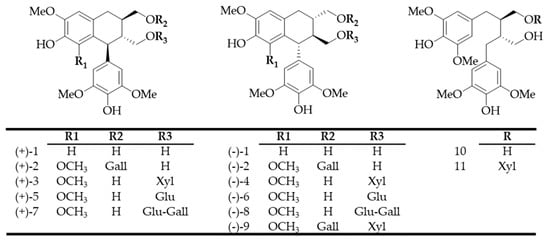 Chemical structures of lignans 1–11. Xyl, Glu, and Gall correspond, respectively, to β-xylopyranose, β-glucopyranose, and galloyl.