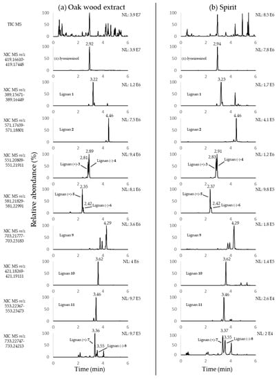 Their presence has not been reported in spirits until now, even though maturation in barrels is crucial for fine-tuning their sensory properties. To determine whether these lignans were likely to impact the taste of spirits, their presence was first investigated by screening a cognac aged for 23 years. Based on mass measurement accuracy, LC-HRMS is a powerful technique in screening samples by targeting the characteristic m/z ions of specific empirical formulas. To this end, the chromatographic and spectrometric conditions described by Marchal et al. [] were applied. Extracted ion chromatograms (XICs) were obtained in an oak wood extract (Figure 2a) and in a spirit (cognac, Figure 2b) by considering the m/z ratios specific to the deprotonated ions ([M − H]−) of (±)-lyoniresinol and lignans 1 to 11 with a 3-ppm tolerance window (Figure 2).