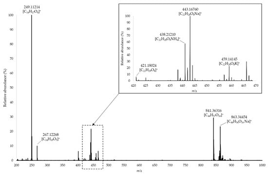 The full scan HRMS spectrum of (±)-lyoniresinol (C22H28O8) presented several ions corresponding to adducts ([M + Na]+, [M + K]+, [M + NH4]+); pseudodimers ([2M + H]+, [2M + Na]+); and fragments (C14H17O4+, C14H19O5+) (Figure 3), but the signal corresponding to protonated ion (C22H29O8+) was very low, whatever the ionization parameters. Preliminary tests showed that quantification was more reliable by using the fragment ion at m/z 249.11214 (C14H17O4+), which was the most intense signal. This chemical species might result from a loss of a dimethoxyphenol group (C8H10O3) jointly with dehydration. Such fragmentation reactions are well known for lignin derivatives [] and can be caused by high temperature []. Spectrometry parameters were tuned to optimize the response of the m/z 249.11214 ion.