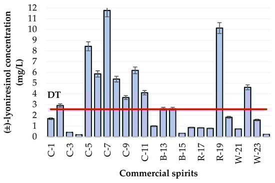 Variations in (±)-lyoniresinol content in 24 commercial spirits. The red line represents the level of the gustatory detection threshold (DT).