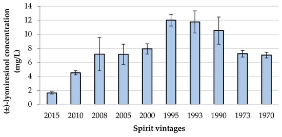 Lyoniresinol was quantified in a series of “eaux-de-vie” of cognac of 10 different vintages from the same distillery and using similar aging conditions. The samples were not commercial cognac, but “eaux-de-vie” still undergoes the aging process in barrels. They were matured in used barrels (a 350-L coarse grain oak barrel). For each vintage, a sample was collected from five different barrels and analyzed. The concentrations presented in Figure 5 correspond to the mean values of these five replicates. The measured values ranged from 1.6 mg/L (2015) to 12 mg/L (1995). For each vintage, the coefficient of variation between the five replicates was relatively low (from 5.7% to 33.2%), revealing a good homogeneity between barrels. From 2015 to 1995, the results showed that the older the “eau-de-vie”, the higher the level of lyoniresinol, confirming previous observations [,,]. Conversely, for older vintages, lower concentrations were measured. This could suggest a degradation of lyoniresinol in long-time barrel storage. Furthermore, aging in used barrels implies a lower extractable potential of the compounds than in new oak barrels and can influence the lyoniresinol content in these vintages. However, this hypothesis needs to be studied more deeply, since the results could also have been due to modifications to aging practices in the distillery or changes in barrel supplies.