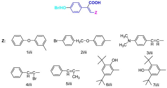 Synthesis of 4-Bromo/hydroxyphenyl-substituted cinnamic acids 1i–7i [,,,]. The title compounds were prepared by a Knoevenangel reaction, as shown in Scheme 1, according to literature methods [,,]. A suitable aldehyde (0.015 mol) was condensed with 4-bromophenylacetic acid or 4-hydroxyphenylacetic acid (0.015 mol) and acetic acid anhydride (10 mL) in the presence of triethylamine (5 mL). The reaction mixture was refluxed for approximately 5 h (while monitoring completion of the reaction). The solution was poured into 2 N HCl, and ice and the precipitate formed was collected by filtration and recrystallized from 50% v/v aqueous ethanol. In case that no precipitate was formed an extraction with 3 × 100 mL CHCl3 was made and the organic phase was collected, dried over MgSO4 and evaporated to dryness affording a residue that was recrystallized from 50% aqueous ethanol.