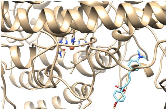 Docking pose of 3i (depicted in blue) bound to soybean lipoxygenase (LOX-1). The iron ion is depicted as an orange sphere.