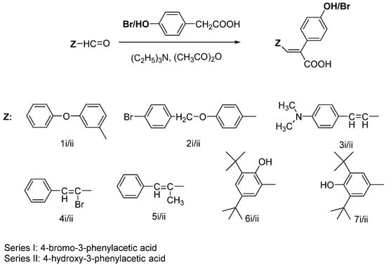 The synthesis of cinnamic acids was achieved by a Knoevenagel condensation as shown in Scheme 1. Acids of series I were derived from the condensation of the suitable cinnamic aldehyde with 4-bromo-3-phenylacetic acid and acetic anhydride in the presence of trimethylamine, while for the acids of series II the same synthetic procedure was used but with 4-hydroxy-3-phenylacetic acid.