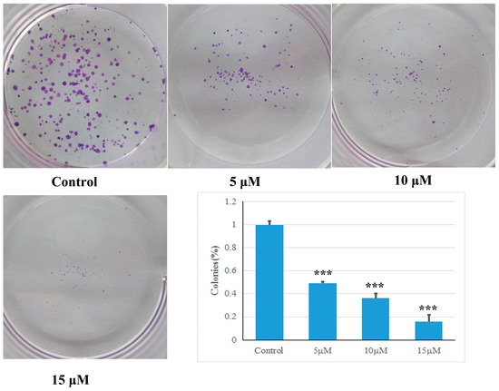 The colony formation of HCT-116 cells after treatment with different concentration (5, 10 and 15 μM) of compound 5d for 7 days; The rate of inhibition induced by compound 5d was expressed as the mean ± SD of three independent experiments, *** p < 0.001 vs control group (untreated cells); The clonogenicity assay was quantified using Image J software.