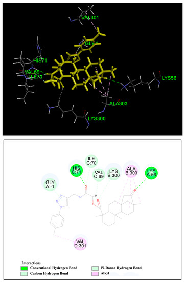 Our cell cycle study revealed compound 5d induced arrest in S phase of the HCT-116 cells and western blot analysis demonstrated the mechanism of action may be correlated with down-regulation of cyclin A, in addition, cyclin A and CDK2 form a complex that plays a key role in the regulation of the S phase. Therefore, in order to better understand the potency of compound 5d and to gain further understanding of the probable binding model, molecular docking studies with CDK2/cyclin A (PDB ID: 3my5) were performed. The studies were performed as a crucial step towards understanding the specific position of interaction between compound 5d and CDK2/cyclin A complex [42]. The docking results revealed that compound 5d was held in the active pocket by a combination of various hydrogen bonds and alkyl interactions with CDK2/cyclin A (Figure 6). The carbonyl group of isosteviol interacted with the -NH2 group of Lys-A56 via hydrogen bond, while the carbonyl group of 1,2,3-triazole chloroacetamides interacted with the -NH- moiety of Lys-A56 via hydrogen bond, which supported the preceding drug design. Meanwhile, the 1,2,3-triazole moiety formed one pi-donor hydrogen bond with Gly-A1 residue, as well as the methylenecarbonyl group and the carbonyl group of C-19 formed three carbon hydrogen bond with Ile-C70, Val-C69 and Lys-B300 amino acids. Additionally, the methyl group at the para position of the benzene ring formed a favorable alkyl interaction with Val-D301 residue. It was also observed that the B and C ring of isosteviol showed alkyl interaction with amino acid residue Ala-B303. The CDOCKER interaction energy score was 41.3422. These indicate that compound 5d has a strong binding affinity for the CDK2/cyclin A complex and may play a crucial role in inhibiting its activity.