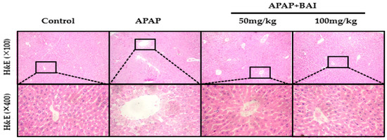 As presented in Figure 3, H&E staining demonstrated that APAP induced substantial hepatic centrilobular necrosis and inflammatory cell infiltration, as well as the destruction of liver structure around the blood vessels, intrahepatic hemorrhage, and nuclear shrinkage compared with control; all the biochemical and histological changes were significantly alleviated by BAI treatment in a dose-dependent manner.