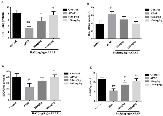 Pretreatment with BAI protected against APAP-induced liver injury: Effects of BAI on the hepatic of glutathione (GSH) (A), malondialdehyde (MDA) formation (B), superoxide dismutase (SOD) (C), CAT (D) in APAP-induced mice; values are expressed as the mean ± S.D., n = 8. * p < 0.05, ** p < 0.01 compared with the model group; # p < 0.05, ## p < 0.01 compared with control group.