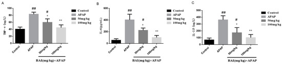 Effects of BAI on liver inflammatory responses. TNF-α (A), IL-6 (B) and IL-1β (C) levels from mice in each experimental group were determined by commercial kits. All data are expressed as mean ± S.D., n = 8. * p < 0.05, ** p < 0.01 compared with the model group; # p < 0.05, ## p < 0.01 compared with control group.