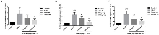 As shown in Figure 6, compared with the control group, the APAP group expressed higher levels of TNF-α, IL-6, IL-1β mRNA, which were significantly reduced by BAI.