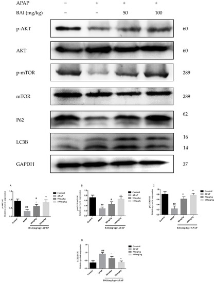 As shown in Figure 7, the increased conversion of LC3B II/I after APAP injection was decreased in a dose-dependent manner after BAI treatment. The levels of p-AKT and p-mTOR of APAP group were increased by BAI. Furthermore, BAI elevated p62 expression in comparison to the APAP group. These changes directly affected the viability of liver cells.