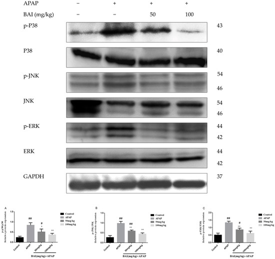 Effects of BAI on p-P38, P38, p-JNK, JNK, p-ERK and ERK protein expression. Protein samples were extracted from liver tissue homogenates and analyzed by western blot. Effects of BAI on APAP-induced p-P38, P38, p-JNK, JNK, p-ERK and ERK in liver and statistical analysis of p-P38, P38, p-JNK, JNK, JNK and ERK protein expression (A–C). Control, APAP group; 50 mg/kg, 100 mg/mg BAI group; All data are expressed as mean ± S.D. n = 3. * p < 0.05, ** p < 0.01 compared with the model group; ## p <0.01, # p <0.05 compared with control group.