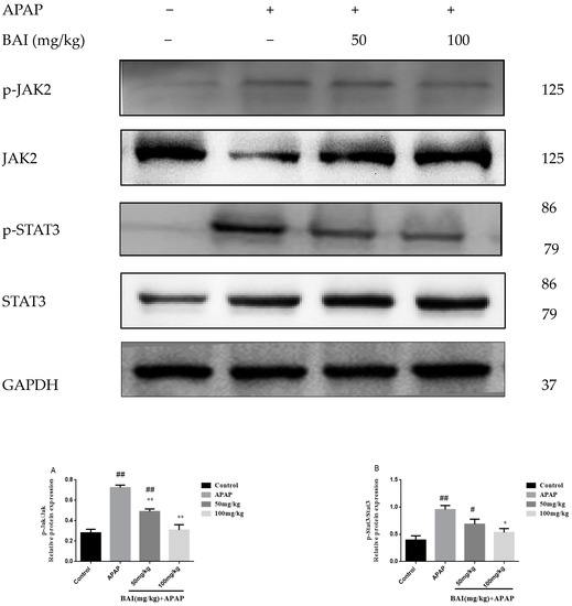 We investigated the roles of BAI in the expression of phospho-Janus kinase signal transducers 2 (p-JAK2) and phospho-Signal transducer and activator of transcription 3 (p-STAT3) proteins in APAP-induced liver injury. Although the differences were not significant, the contents of p-JAK2 and p-STAT3 (Figure 9) proteins of APAP group increased than those of the control group. However, treatment with BAI could significantly reduce p-JAK2 and p-STAT3 proteins, the expressions p-JAK2 (Figure 9A) and p-STAT3 (Figure 9B) proteins in the mice treated with BAI were significantly lower than that of the APAP group.