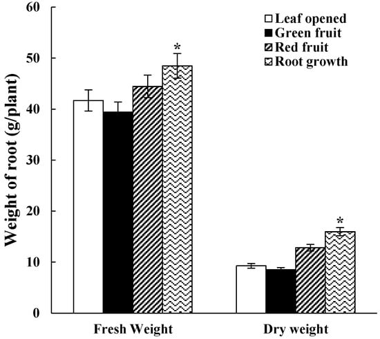 Fresh and dry weights of ginseng roots at different growth stages. The data are expressed as the mean ± SD. * indicated that the different growth stages are significantly different at the 0.05 level.