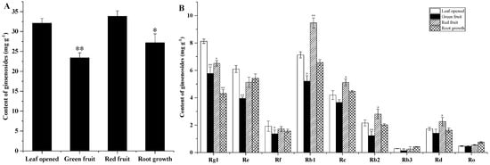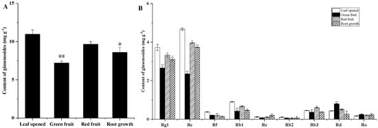 Ginsenoside contents of leaves from Panax ginseng during the different growth stages. The total ginsenoside content in the leaf (A) and the major individual ginsenosides in the leaf (B) were analyzed according to the leaf opened, green fruit, red fruit, and root growth stages. Vertical bars indicate the mean ± standard error from three independent experiments. The data are expressed as the mean ± SD. * indicated that the different growth stages are significantly different at the 0.05 level. ** indicated that the different growth stages are significantly different at the 0.01 level.