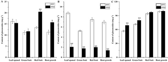 The ginsenoside compositions of the root (A), leaf (B), and stems (C) in the different growth stages. Vertical bars indicate the mean ± standard error from three independent experiments. * indicated that the different growth stages are significantly different at the 0.05 level. ** indicated that the different growth stages are significantly different at the 0.01 level.