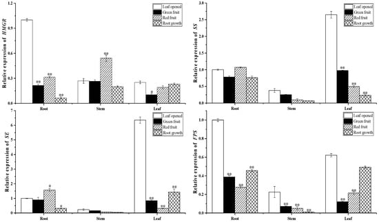 As shown in Figure 6, Figure 7 and Figure 8, expression of the upstream gene HMGR, FPS, SS and SE in the root and leaves rapidly decreased from the leaf opened to green fruit stage (78.5% and 58.9%, respectively, for HMGR; 61.2% and 80.4%, respectively, for FPS; 21.8% and 63.2%, respectively, for SS; 10.2% and 86.7%, respectively, for SE). The other genes showed similar expression patterns. The downstream genes DS, PPDS, and PPTS of the ginsenoside biosynthesis pathway were expressed more highly in leaves than other organs. On the contrary, β-AS and OAS were expressed more highly in roots than other organs. Interestingly, the expression pattern of the β-AS gene in roots at different growth stages is opposite to that of the OAS gene. It is speculated that there is a mutual inhibition between the two genes at different growth stages.