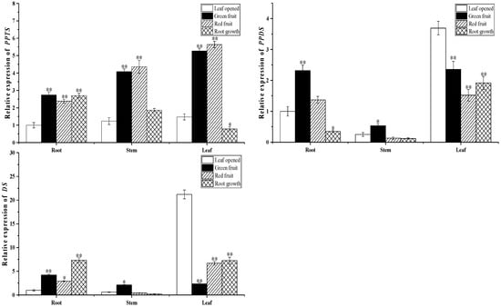 Expression of genes related to ginsenoside biosynthesis in roots, stems, and leaves during different growth times. The relative expression of (A) PPTS, (B) PPDS, and (C) DS genes in the leaf opened, green fruit, red fruit, and root growth stages was analyzed by real-time polymerase chain reaction. Vertical bars indicate the mean ± standard error from three independent experiments. * indicated that the different growth stages are significantly different at the 0.05 level. ** indicated that the different growth stages are significantly different at the 0.01 level.