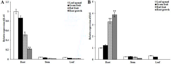 Expression of genes related to ginsenoside biosynthesis in roots, stems, and leaves during different growth times. The relative expression of (A) β-AS and (B) OAS genes in the leaf opened, green fruit, red fruit, and root growth stages was analyzed by real-time polymerase chain reaction. Vertical bars indicate the mean ± standard error from three independent experiments. * indicated that the different growth stages are significantly different at the 0.05 level. ** indicated that the different growth stages are significantly different at the 0.01 level.