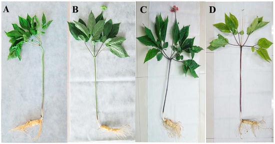 Samples of fresh roots, stem, leaves, and berries from 5-year-old Ginseng plants were obtained from plants growing in the LaoLing plot (N41°54′37″, E127°41′27″), located in Fusong County, Jilin Province, China. It was identified as Panax ginseng C.A. Meyer by Professor Yang Limin from the College of Chinese Herbal Medicine of Jilin Agricultural University. Roots, stem, leaves, and berries were sampled at different growth stages (leaf opened, green fruit, red fruit, and root growth stage) (Figure 9). During leaf unfolding, curled leaves unfold gradually to become entirely flat. Smooth leaves lack wrinkles, and vary in color from dark green to matte yellow-green. At first leaf growth is very slow, and this picks up over time. During the green fruit stage, withered petals undergo abscission, ovaries gradually expand, and small fruit appear along the inflorescence. During this period, the plant reaches peak consumption of water and soil nutrients, as well as peak photosynthetic activity. This increased activity is presumably required to meet the energetic and nutrient needs of growing fruit and storage roots. During the red fruit stage, fruit enlarge, and change in color twice, first from green to purple, then from purple to red. During the root growth stage, in order to provide nutrients for the growth of roots, stems, and leaves, organic matter produced in the stems and leaves is transported to the underground organs for storage. This growth time is specific to perennial herbs, as annuals die before overwintering. A portion of plant materials were immediately frozen in liquid nitrogen upon harvesting and stored at –80 °C for RNA isolation, and the other portion was dried at 60 °C for seven days and used for ginsenoside analysis. Three independent biological replicates were prepared and each replicate included material from three or more plants.