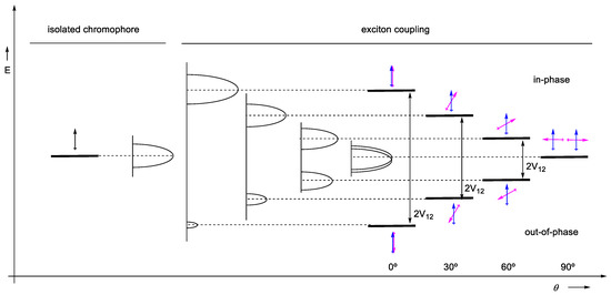Electronic Circular Dichroism (ECD) is one of the most used chiroptical spectroscopies [8,9]. Comparison of the experimental and theoretically-predicted ECD spectra is routinely used not only for absolute and relative configuration assignment of small and medium-sized molecules [10], but also for elucidating the conformational preferences of the systems under study [11,12]. The level of theory employed for the simulation of the ECD spectra must be carefully chosen according to the nature of the systems under study [13]. As an alternative to the use of ab initio calculations, the exciton chirality method can be applied when two independent chromophores are present in the molecule [14]. The more general phenomenon known as the Davydov splitting [15], 2V12, emerges from the excitation energy splitting between the in-phase and out-of-phase simultaneous two-chromophore transitions, strongly dependent on their relative orientation (Scheme 1).