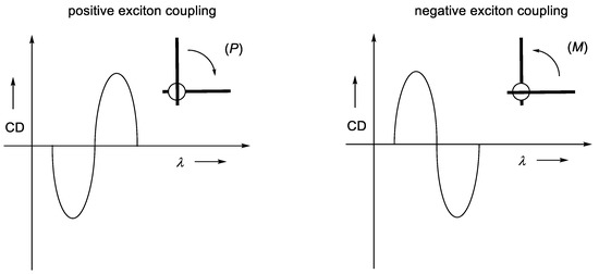 When the arrangement between the interacting chromophores is chiral, the Cotton effects emerging from the in-phase and out-of-phase excitations in the CD spectrum present opposite signs. Notable, the sign of the less energetic band in the resulting bisignated CD signal is diagnostic of the handedness of the chiral arrangement between the chromophores, allowing the absolute configuration determination of many compounds [14,16] (Scheme 2).