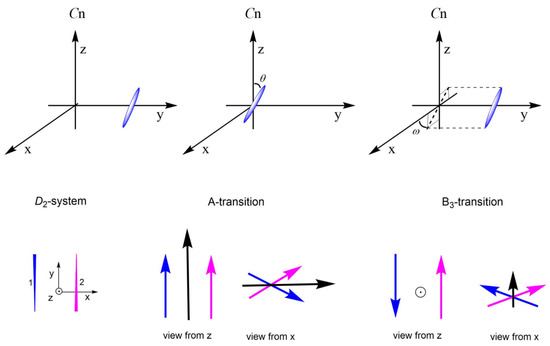 This outcome is comparable with the analysis of C2 and D2 symmetric systems in terms of the selection rules. In recent years, we have contributed with a number of highly symmetric systems such as linear [12] and cyclic oligomers [17], molecular containers [18,19], or even all-carbon double helices [20], presenting remarkable chiroptical responses in the search for valuable materials for everyday chiroptical applications [21]. However, analysis of the chiroptical responses is often tedious [22,23]. In this regard, in 1937, Condon [24] revised the work from Kirkwood [25], where he demonstrated the possibility to determine the optical activity of a molecule by considering the relative orientation of the different constituent groups. In 1974, Schellman developed the theory of optical activity with simple electric and magnetic dipole interaction with radiation capable of resampling rather accurately the experimental results [26]. In order to have a more accessible understanding of the behavior of highly symmetric systems, herein we perform the Chiroptical Symmetry Analysis (CSA) and apply it to systems with Cn and Dn symmetries for n = 2, 3, and 4. Even when this approach is more specific, CSA could be applied to any other symmetry, and therefore, we hope that it will serve as a design tool for the development of everyday chiroptical applications in the near future. Additionally, since an exciton coupling approach in Vibrational CD (VCD), known as the coupled oscillator model, has also been employed successfully by Monde [27] and further evaluated by Polavarapu [28], in analogy to electronic transition, the CSA could also be applied for the prediction of the VCD of highly symmetric systems.