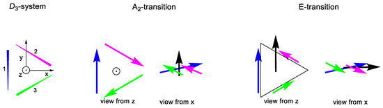The presence of three C2 axes orthogonal to C3 restrains the orientations for EDTMs in D3 systems with regard to C3 ones to those where ω = π/2. As a consequence, the EDTM for the transition to the A2 state follows the same expression obtained for C3 symmetry (49), standing along the main symmetry axis, whereas the EDTMs for transitions to true degenerate E states are contained within the orthogonal plane, being linear combinations of the vectors represented by (61) and (62).