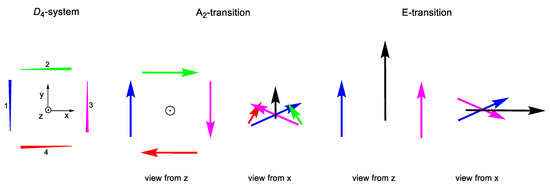 Imposing D4 symmetry (ω = π/2 for Chromophore 1) does not alter any of the expressions shown for transition A. Nevertheless, it allows obtaining vectors with real components for EDTMs and imaginary ones for MDTMs to E degenerate states. These vectors are linear combinations of those shown respectively in (74) and (75). The former is always contained in the orthogonal plane to the C4 axis, whereas the latter are parallel to it.