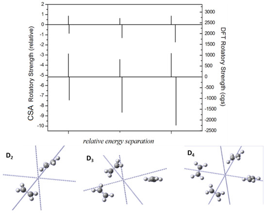 Top: DFT predicted (graph bottom) and CSA predicted (graph top) rotatory strengths for D2, D3, and D4 (from left to right) symmetries. The bottom axis represents the relative energy for each symmetry (from left to right: higher to lower). Bottom: Dn systems.