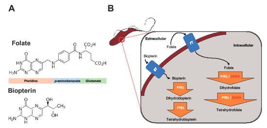 - Bello, A.R.; Nare, B.; Freedman, D.; Hardy, L.; Beverley, S.M. PTR1: A reductase mediating salvage of oxidized pteridines and methotrexate resistance in the protozoan parasite Leishmania major. Proc. Natl. Acad. Sci. USA 1994, 91, 11442–11446. [Google Scholar] [CrossRef] [PubMed]