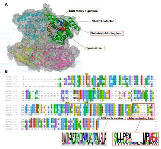 A cartoon representation of the Trypanosoma brucei pteridine reductase 1 (TbPTR1) protein structure (PDB: 2X9N) and a multiple sequence alignment of T. brucei PTR1, T. cruzi PTR1, T. cruzi PTR2, L. major PTR1, and H. sapiens dehydrogenase/reductase (SDR family) member four (DHRS4). (A) The protein is colored by chain, with the NADPH cofactor colored blue and the co-crystallized ligand cyromazine colored orange. TbPTR1 is a tetramer and the α/β single domain subunit (chain A) is shown in green. The substrate binding loop is colored red and was composed of residues SER207–GLU215, while the SDR family signature, which is colored brown, was composed of residues ASP161–ALA193. (B) The multiple sequence alignment (MSA) showed notable conservation in the SDR family signature, as shown by the sequence logo of the extracted motif. The MSA also showed that within the substrate binding loop there was a four residue deletion that was present only among the trypanosomatids.
