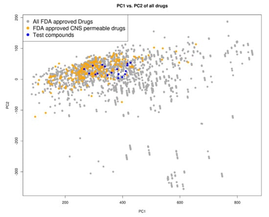Chemical space distribution of the test compounds (n = 18), Food and Drug Administration (FDA)-approved drugs (n = 3180), and FDA-approved central nervous system (CNS)-permeable drugs (n = 221). The principal component analysis (PCA) of the molecular descriptors showed that the test compounds clustered well with FDA-approved CNS-permeable drugs. The PCA scatter plot was based on the first (PC1) and second (PC2) components as shown on the two axes. PC1 explained 76% of the variance while PC2 explained 18%. All FDA-approved drugs are shown as grey dots, while FDA-approved CNS-permeable drugs are shown as yellow dots and the test compounds are shown as blue dots.