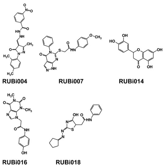 Overall, our in silico rational-based drug discovery approach was able to identify five compounds that showed anti-trypanosomal in vitro activity. Compounds RUBi007, RUBi016, and RUBi018 showed no significant human cell cytotoxicity at 100 µM, while RUBi004 and RUBi014 had cytotoxicity IC50s of 23.6 ± 5.8 μM and 32.9 ± 2.2 μM, respectively (Figure S12). RUBi014, also known as eriodictyol, is a flavonoid that has previously been reported to be selectively anti-protozoal with activity against T. brucei in culture [39,40]. RUBi018 is related to 4-aryl-2-(1-substituted ethylidene) thiazoles that have been previously reported to show anti-bacterial activity [41]. To our knowledge, there has been no specific activity reported in the literature for the rest of the compounds.
