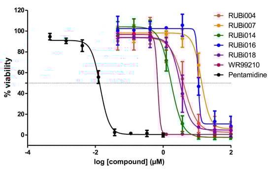 Dose-response plots to derive IC50 values for RUBi004 (red), RUBi014 (orange), RUBi007 (green), RUBi016 (blue), RUBi018 (purple), WR99210 (maroon), and pentamidine (black). Pentamidine was used as the positive control anti-trypanosomal compound. Parasite % viability was determined using the resazurin method. Error bars indicate the standard deviation of % viability obtained in three replicate wells. The above graph represents one of three independent experiments that were performed on separate occasions. The combined IC50 values (± standard deviation) of RUBi004, RUBi007, RUBi014, RUBi016, and RUBi018 were determined to be 9.6 ± 3.2 μM, 34.9 ± 17.1 μM, 14.6 ± 9.9 μM, 25.4 ± 4.7 μM, and 12.7 ± 3.7 μM, respectively. The IC50 values of WR99210 and pentamidine were determined to be 0.5 ± 0.4 µM and 0.014 µM, respectively.