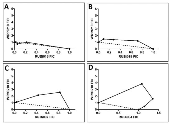 Isobologram analysis of compounds RUBi016 (A), RUBi018 (B), RUBi007 (C), RUBi004 (D) and RUBi014 (E) in combination with WR99210. RUBi compounds and WR99210 were employed alone at starting concentrations of 100 µM and 20 µM, respectively, and in combination ratios of 75:25, 50:50, and 25:75. IC50 values obtained for the RUBi compounds and WR99210 alone and in combination were used to calculate and plot their fractional inhibitory concentrations (FIC). The dotted line in the graphs denotes an additive effect; FIC values above the line indicate compound antagonism, while values below the line indicate synergism.