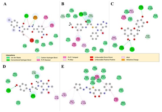 The 2D structures of RUBi004, RUBi007, RUBi014, RUBi016, and RUBi018, along with their binding modes in the TbPTR1 protein. (A) A 2D representation of RUBi004 and its binding mode with TbPTR1; (B) a 2D representation of RUBi007 and its binding mode with TbPTR1; (C) a 2D representation of RUBi014 and its binding mode with TbPTR1; (D) a 2D representation of RUBi016 and its binding mode with TbPTR1; and (E) a 2D representation of RUBi018 and its binding mode with TbPTR1.