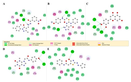 The 2D structures of RUBi004, RUBi007, RUBi014, RUBi016, and RUBi018, along with their binding modes in the TbDHFR protein. (A) A 2D representation of RUBi004 and its binding mode with TbDHFR; (B) a 2D representation of RUBi007 and its binding mode with TbDHFR; (C) a 2D representation of RUBi014 and its binding mode with TbDHFR; (D) a 2D representation of RUBi016 and its binding mode with TbDHFR; and (E) a 2D representation of RUBi018 and its binding mode with TbDHFR.