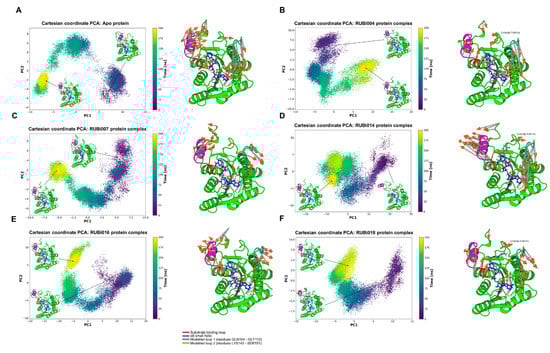 Principal component analysis of the TbPTR1 apo protein and TbPTR1-ligand complexes. The motion of the protein during 200 ns of the all-atom MD simulation is shown along the first and second principal components (PC1 and PC2). The substrate binding loop (residues SER207–GLU215) is colored red, the α6 alpha helix (residues GLY214–VAL225) is colored magenta, the modelled missing residues loop 1 is colored cyan, the modelled missing residues loop 2 is colored yellow, and the NADPH cofactor is colored blue. (A) Apo protein, (B) TbPTR1-RUBi004 complex, (C) TbPTR1-RUBi007 complex, (D) TbPTR1-RUBi014 complex, (E) TbPTR1-RUBi016 complex, and (F) TbPTR1-RUBi018 complex. For each of these, on the left is the projection of the protein-ligand complex dynamics along the PC1 and PC2, and on the right are the differential motions described by PC1 and PC2, shown by light gray arrows with orange tips.