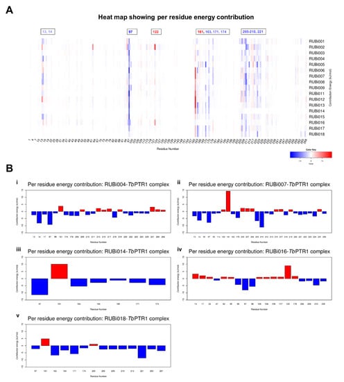 A heat map and histograms showing the per residue energy contributions to binding (with energy in kJ/mol). The compounds bound in similar conformations to known pterin, folates, and PTR1 inhibitors, as is shown by the common contributing residues to binding. (A) A heat map showing the per residue energy contributions for all the protein-ligand systems and (B) a histogram showing the main residues contributing energetically to binding in (i) TbPTR1-RUBi004, (ii) TbPTR1-RUBi007, (iii) TbPTR1-RUBi014, (iv) TbPTR1-RUBi016, and (v) TbPTR1-RUBi018 complexes.