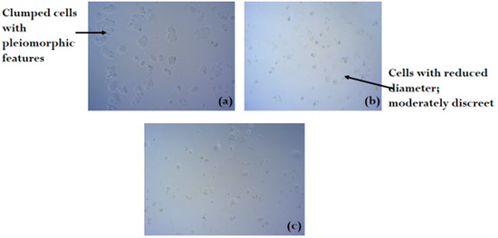 Photomicrograph of breast cancer cell line (a) untreated, (b) treated with cisplatin, and (c) treated with compound 3 (H&E × 100).