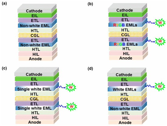 To furnish white emissions, complementary-color emitters, three-color emitters or four-color emitters (e.g., blue/yellow, blue/orange, blue/red, blue/green/red, blue/yellow/red, blue/green/yellow/red) are commonly required [78,79,80,81,82,83,84,85]. For single-unit WOLEDs, the emitting layers (EMLs) can be composed of single or multiple EMLs. In general, single-EML WOLEDs only need one EML comprised of a versatile host doped with different color guests, while multiple-EML WOLEDs require at least two EMLs to produce white emissions [86,87,88,89,90,91]. Accordingly, the EL unit of tandem WOLEDs could be comprised of non-white or monochromatic EMLs, where various-color EMLs are located in different EL unit to combine for the white emission (type-I tandem WOLED architecture), as shown in Figure 1a. Besides, each unit of tandem of WOLEDs can be made up of multiple-EML white unit (type-II tandem WOLED architecture, Figure 1b) or single-EML white unit (type-III tandem WOLED architecture, Figure 1c). Alternatively, two unit-based tandem WOLEDs can be constructed by a white unit and a non-white unit (type-IV tandem WOLED architecture, Figure 1d). Based on the above facts, highly efficient phosphorescent and TADF emitters are usually adopted in tandem WOLEDs, which is expected to harvest both singlet and triplet excitons for the high performance [92,93,94,95,96,97]. After the optimization of EMLs, CGLs are selected to interconnect each EL unit. As a result, tandem WOLEDs will be formed. It is deserved to note that most of tandem WOLEDs are focused on two or three EL units, although more than four units can be connected with CGLs.