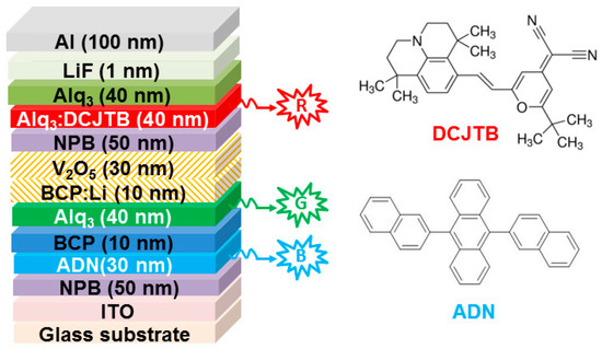The first tandem WOLED was based on fluorescent emitters, in which 4-(dicyanomethylene)-2-t-butyle-6-(1,1,7,7-tetramethyljulolidyl-9-enyl) 4H-pyran (DCJTB), Alq3 and 9,10-bis-(β-naphthyl)-anthrene (ADN) were used as the red (600 nm), green (505 nm) and blue (435 nm) fluorescent emitter, respectively [72]. The device structure was ITO/NPB (50 nm)/ADN (30 nm)/BCP (10 nm)/Alq3 (40 nm)/BCP:Li (10 nm)/V2O5 (30 nm)/NPB (50 nm)/Alq3:DCJTB (40 nm)/Alq3 (40 nm)/LiF (1 nm)/Al (200 nm), which can be classified into type-I tandem WOLED architecture, as shown in Figure 2. As a result, the tandem WOLED showed a stable white light with CIE coordinates from (0.35, 0.32) at 18 V to (0.36, 0.36) at 50 V. The maximum luminance of 10,200 cd m−2 and CE was 10.7 cd A−1, which were equal basically to the sum of the two EL units. For the origin of strikingly enhanced performance, the CGL of BCP:Li (10 nm)/V2O5 (30 nm) played a key role. In brief, electrons and holes were generated within the CGL and then reached nearby Alq3 and NPB, respectively. On one hand, these electrons could arrive at the blue EML ADN to recombine with holes injected from anode, generating blue emission. Since BCP is a hole-blocking material, the holes distribution could be manipulated by adjusting the thickness of BCP layer, assuring blue and green emissions. On the other hand, holes generated from the CGL could reach the red EML Alq3:DCJTB and recombine with electrons injected from cathode, producing the red emission. Therefore, white emission has been achieved.