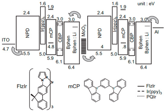 Top: Proposed energy-level diagram of tandem WOLEDs. Numbers indicate the HOMO and LUMO energies relative to vacuum. The arrows indicate the carrier injection from electrodes and the MoO3 CGL. Bottom: The molecular structures of Ir(flz)3 and mCP. Reproduced from reference [155].