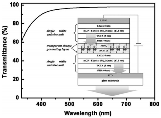 Transmittance spectrum of Li:BCP (10 nm)/MoO3 (7 nm) thin film. Inset: schematic device structure of the tandem WOLED. Reproduced from reference [162].