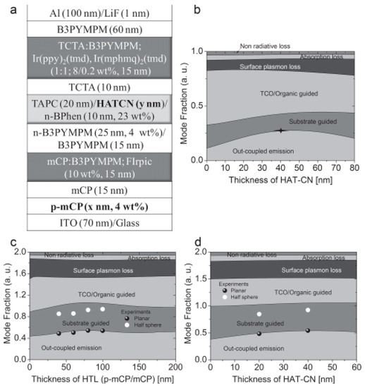 indicates the thickness of HATCN when an out-coupled mode is maximized. (c) Mode analysis of white light as a function of the total HTL thickness at an HATCN thickness of 40 nm. (d) Mode analysis of white light as a function of HATCN thickness with a total HTL thickness of 80 nm. Reproduced from reference [163].