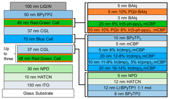 It is well-known that blue phosphorescent emitters usually exhibit poor stability [169,170,171,172,173]. Hence, the lifetime of tandem phosphorescent WOLEDs is limited. Recently, a strategy to address this issue has been proposed by Coburn et al. [174]. The device structure was glass substrate/150 nm ITO/10 nm HATCN/30 nm NPD/1-3 red-green emitter-CGL pairs (D3-D5, respectively)/blue element/CGL/red-green element/50 nm BPyTP2/1.5 nm 8-hydroxyquinolinato lithium (LiQ)/100 nm Al, where the red-green element was 10 nm 4,40-bis(3-methylcarbazol-9-yl)-2,20-biphenyl (mCBP):8 vol % Ir(5′-Phppy)3:10 vol % PQIr/25 nm mCBP:9 vol % Ir(5-Ph-ppy)3/3 nm BAlq/5 nm BAlq:10 vol % PQIr/5 nm BAlq, the blue element was 20 nm mCBP:18 → 14 vol % Ir(dmp)3/10 nm mCBP:11 → 19 vol % Ir(dmp)3:3 vol % mer-tris(N-phenyl, Nmethyl-pyridoimidazol-2-yl)iridium(III) (mer-Ir(pmp)3)/20 nm mCBP:12 → 8 vol % Ir(dmp)3/5 nm mCBP:8 vol % Ir(dmp)3/5 nm mCBP/10 nm BPyTP2, the CGL was 8 nm 2,7-bis(2,20-bipyridine-5-yl)triphenylene (BPyTP2)/12 nm BPyTP2:3 vol % Li/12 nm HATCN/5 nm NPD, D3, D4, and D5 indicated the total number of stacked elements separated by CGLs, as shown in Figure 6. As a result, the optimized tandem WOLED D5 showed a CCT of 2780 K, CRI of 89, a peak PE of 50 lm W−1 and a T70 lifetime (defined as the time corresponding to 30% decrease in luminance from an initial value of 1000 cd m−2) of 80,000 ± 2000 h, with minimal spectral shifts during aging. The key features for the high performance were red emissive blocking layers in the red-green element, graded doping and hot excited state management in the blue element, stable and low voltage CGLs, and effective outcoupling technique. More specifically, (i) stable bis(8-hydroxy-2-methylquinoline)-(4-phenylphenoxy)aluminum (BAlq) was employed as a hole blocking layer for green element and a thin spacer between the green EML and red doped region, which could also reduce the loss of excitons transferred to its low triplet energy; (ii) the exciton confinement at the EML interface with NPD was obtained by doping red phosphor into a thin green EML adjacent to HTL; (iii) placing red EMLs on both sides of green EML reduced the color shift; iv) dopant grading balanced hole and electron transport in blue EML, broadening the exciton recombination zone and reducing bimolecular annihilation rates that lead to molecular dissociation, which could increase the blue element stability; (v) mer-Ir(pmp)3 was used to improve the reliability of the blue element by reducing the probability that hot excited states degrade host or emitter molecules; (vi) the CGL was stable and possessed high charge mobility; (vii) an outcoupling improvement of 2.2 ± 0.2 times over substrate emission by outcoupling substrate modes using index matching fluid between the device substrate and photodetector during the EQE measurement.