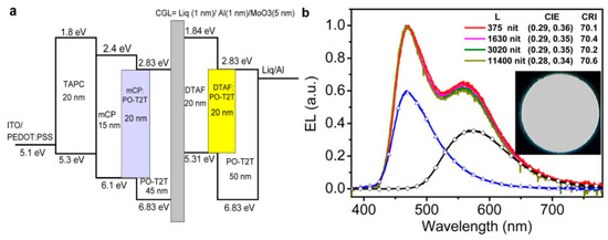By using effective CGLs to interconnect the TADF emitters (TADF materials or TADF exciplexes), tandem TADF WOLEDs can be achieved. Toward this target, Hung and coworkers demonstrated a tandem WOLED, in which blue TADF exciplex EL unit and yellow exciplex EL unit were interconnected by a CGL of 9,9-di[4-(di-p-tolyl)aminophenyl]fluorine (DTAF)/MoO3/Al/Liq (holes and electrons were generated from the DTAF/MoO3 interface) [197]. The structure was ITO/polyethylene dioxythiophene:polystyrene sulfonate (PEDOT:PSS, 30 nm)/TAPC (20 nm)/mCP (15 nm)/mCP:(1,3,5-triazine-2,4,6-triyl)tris(benzene-3,1-diyl))tris(diphenylphosphine oxide) (PO-T2T) (1:1, 20 nm)/PO-T2T (45 nm)/Liq (1 nm)/Al (1 nm)/MoO3 (5 nm)/DTAF (20 nm)/DTAF:PO-T2T (1:1, 20 nm)/PO-T2T (50 nm)/Liq (0.5 nm)/Al (100 nm), as shown in Figure 7. As a result, am EQE of 11.6% was realized. For such high-efficiency exciplex based tandem WOLED, the efficient blue TADF exciplex is important. To accomplish this goal, Hung et al. synthesized PO-T2T having a low HOMO, low LUMO, high T1 of 2.99 eV and electron mobility of >10−3 cm2 V−1 s−1 as the acceptor. Combined with the mCP donor, the blue TADF exciplex emission could show an EQE of 8.0%, which ensured the high performance of tandem WOLED [188]. In Hung′s device [197], the blue TADF exciplex has been used. To extend this strategy, Zhao et al. used a CGL of 2,4,6-tris(3-(1H-pyrazol-1-yl)phenyl)-1,3,5-triazine (3P-T2T):(Cs2CO3)/Al/MoO3 to interconnect both blue TADF exciplex EL unit (TCTA:Bphen) and orange TADF exciplex unit (TAPC:2,4,6-tris(3-(1H-pyrazol-1-yl)phenyl)-1,3,5-triazine), achieving a tandem TADF WOLED with an EQE of 9.17% [198].